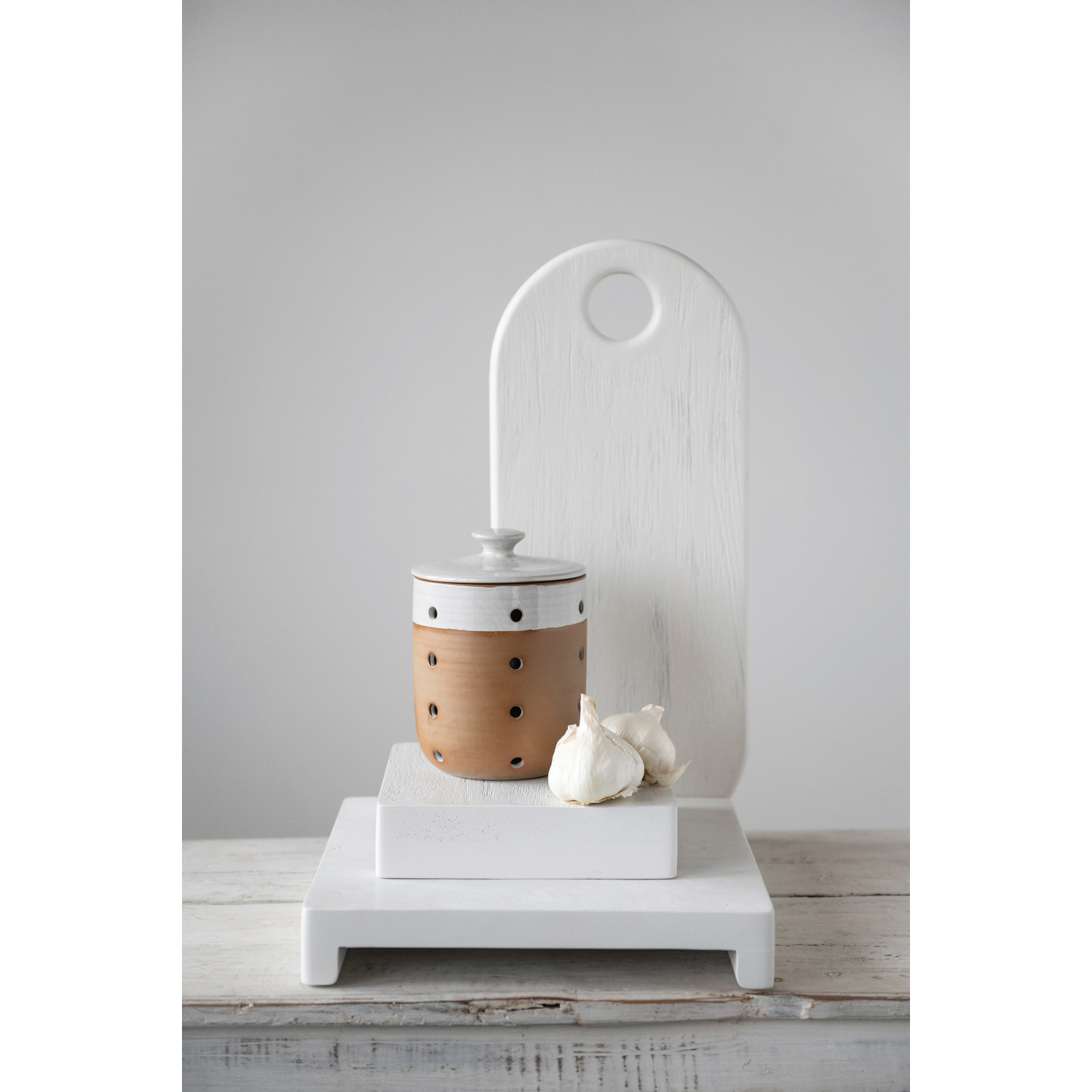 This cheese/serving board is a beautiful addition to any kitchen. Made out of acacia wood, this board has a textured white finish and can be used to cut cheeses or serve small appetizers. This is perfect for serving friends and family in style.