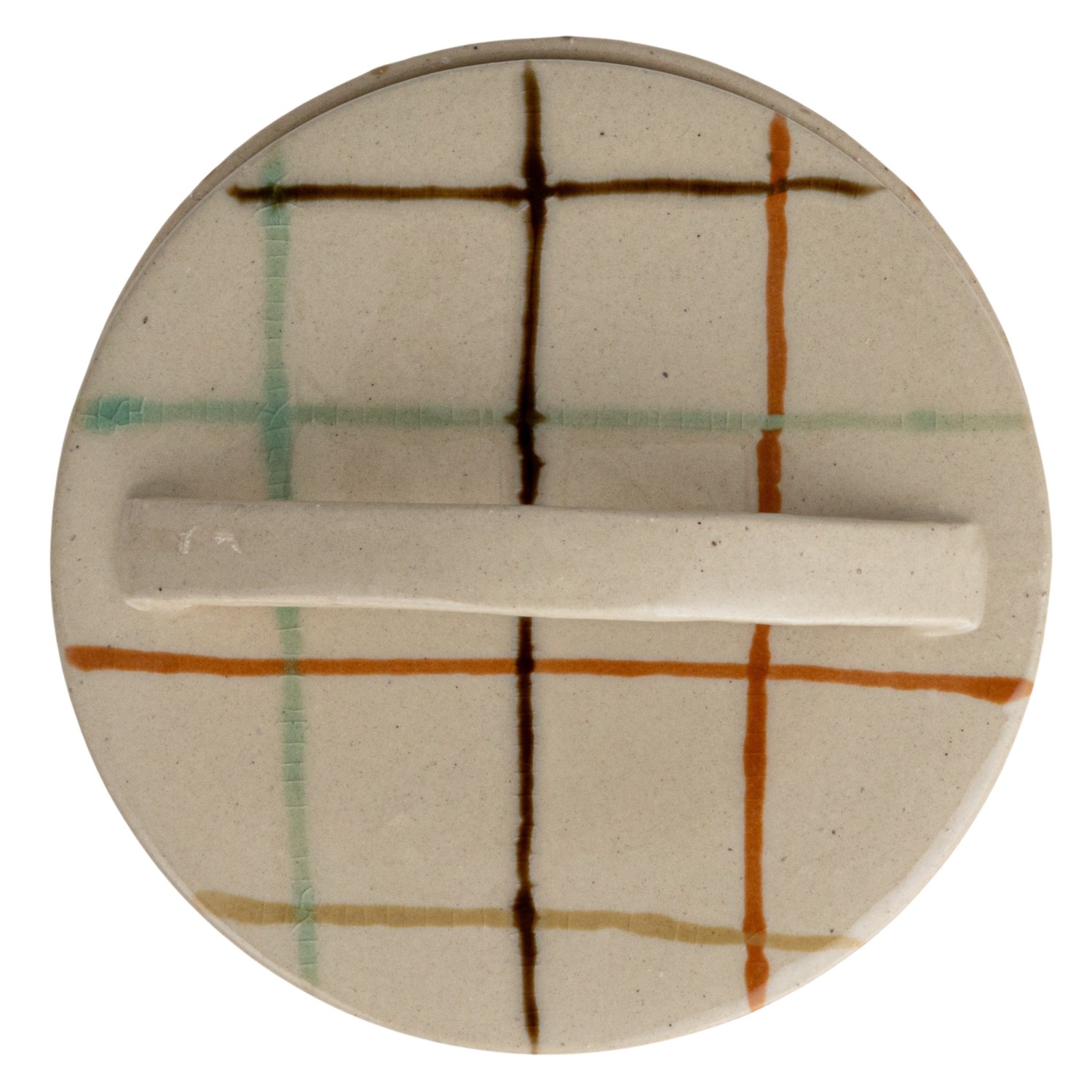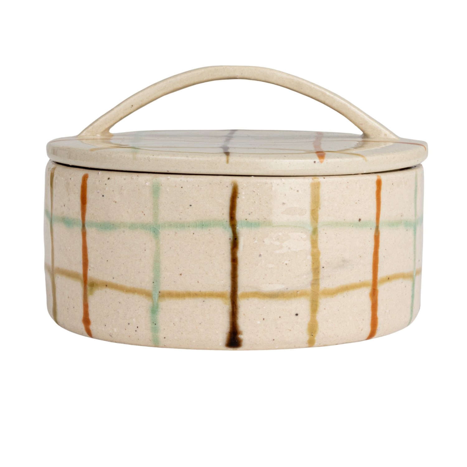 Catalog Name: 5-1/4" Round x 3-1/2"H Hand-Painted Stoneware Dish w/ Grid Pattern & Lid, Reactive Crackle Glaze, Multi Color (Each One Will Vary)