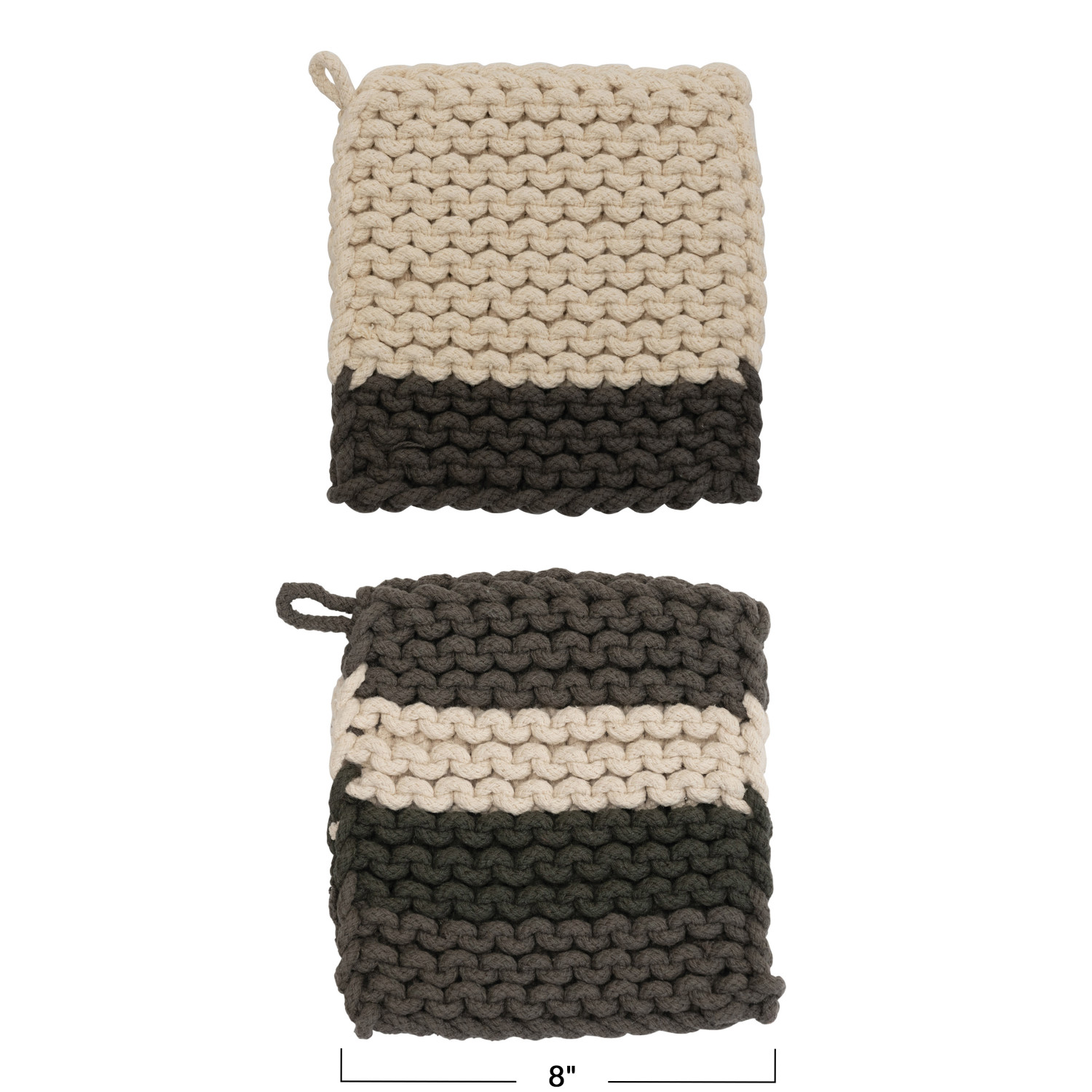 Catalog Name: 8" Square Cotton Crocheted Pot Holder, Charcoal & Cream Color, 2 Styles