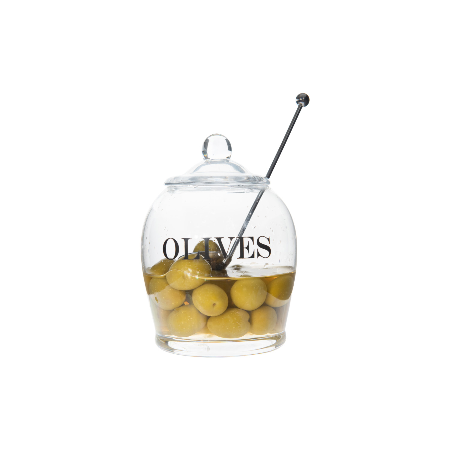If olives are a delicacy in your home, this clear glass jar is a must. It features an attractive shape along with a decorative glass lid and has the word "OLIVES" written across the front. A small opening in the side of the lid allows the included stainless steel spoon to stay in the container even while the lid is on.