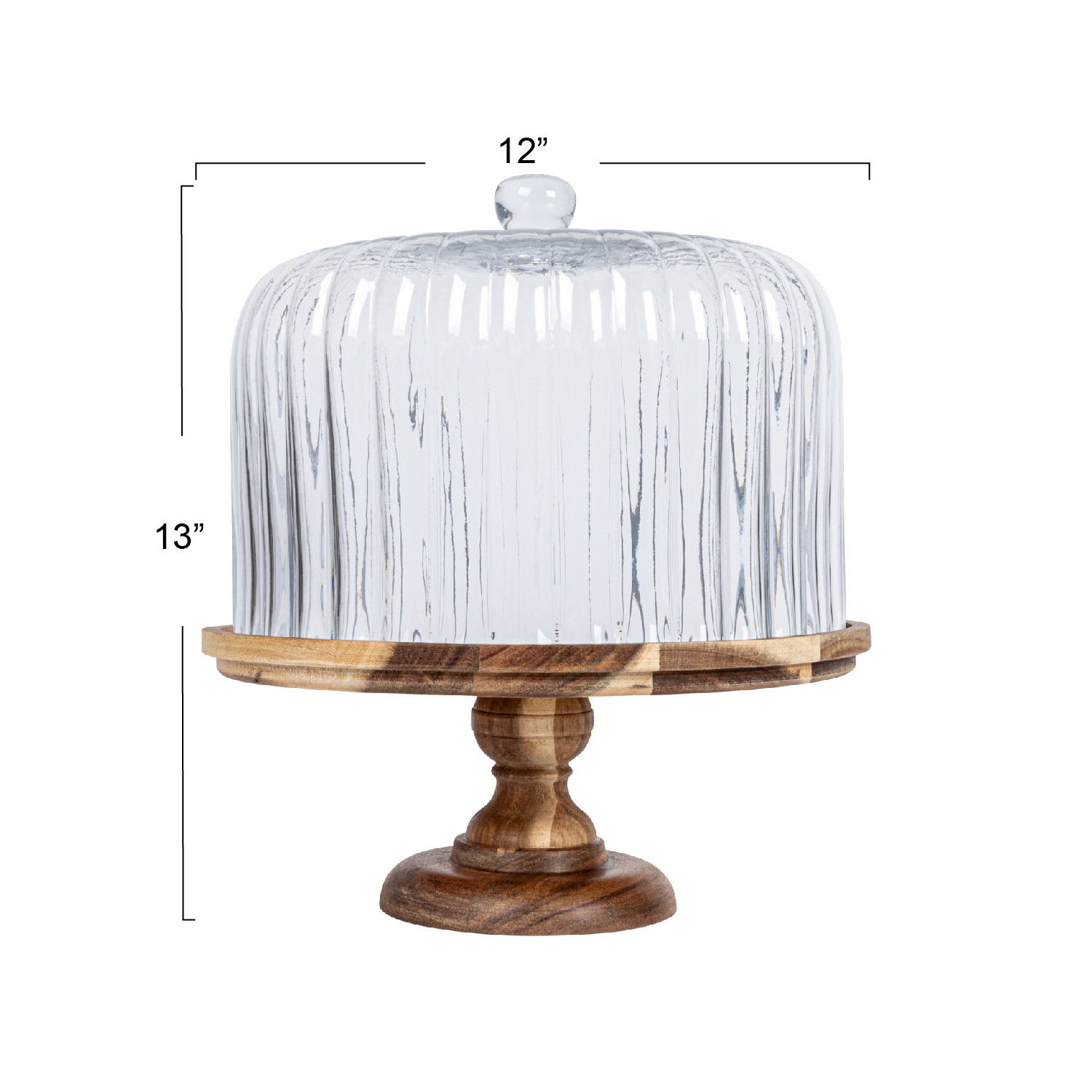 Catalog Name: 12" Round x 13-1/4"H Acacia Wood Pedestal w/ Fluted Glass Cloche, Natural, Set of 2, Truck Ship