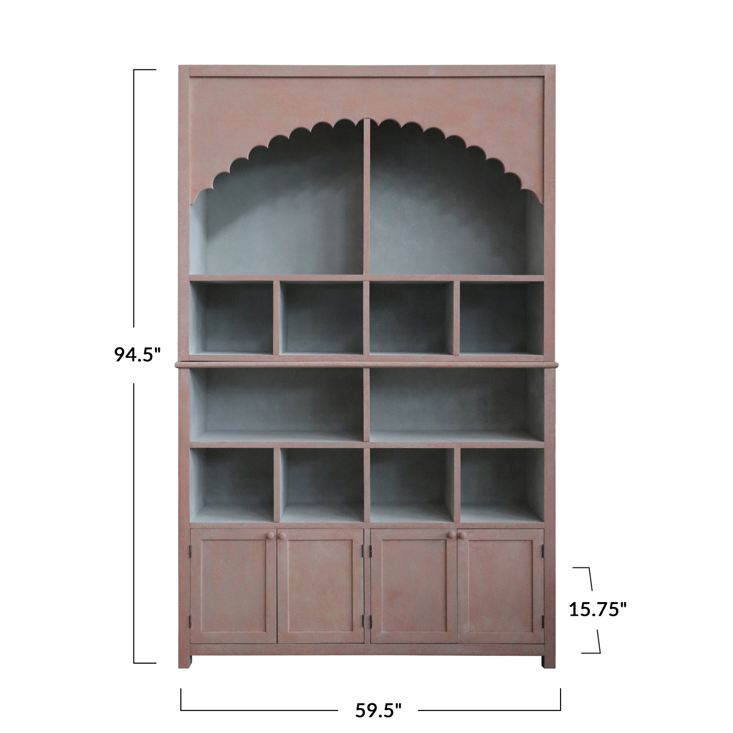 This wood cabinet with a scalloped edge is a beautiful and functional piece of furniture that will enhance any room. It is crafted from high-quality wood that has a stunning antique pink finish that adds warmth and character to the cabinet. The cabinet has a scalloped edge along the top that gives it a unique and elegant shape. The cabinet has 14 compartments that are divided by shelves and doors. The doors also have knobs that make them easy to open and close. The cabinet offers ample storage space for items, display books, dishes, collectibles, or other things. The cabinet measures 59.5 inches in length, 15.75 inches in width, and 94.5 inches in height, making it a substantial and impressive piece of furniture. This wood cabinet with a scalloped edge is a perfect choice for adding farmhouse, boho, Scandinavian, French country, or vintage style to the home.
