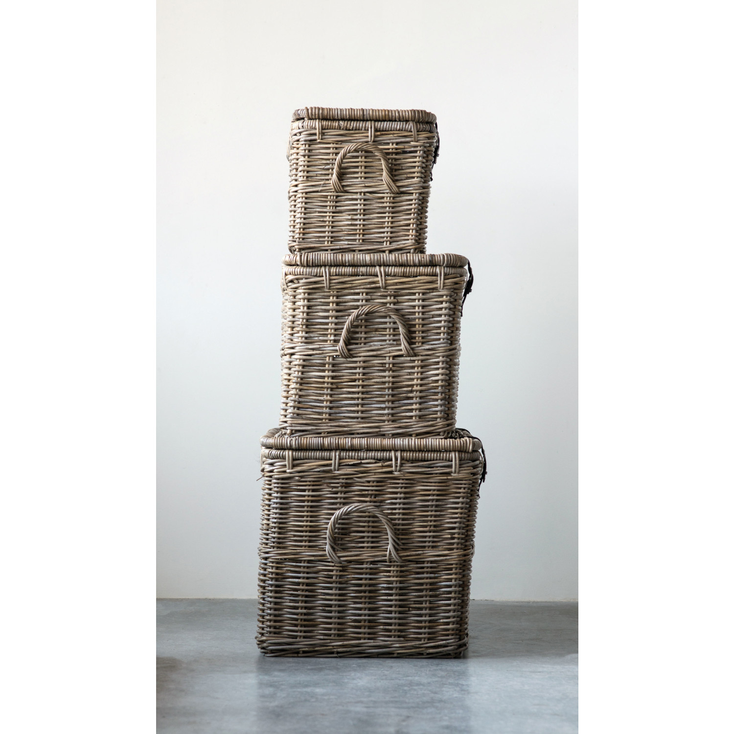 Catalog Name: 36"L x 22-1/2"W x 22"H, 30-1/2"L x 19-1/4"W x 18-3/4"H & 24"L x 15-1/4"W x 14-3/4"H Rattan Nesting Baskets w/ Lids & Leather Buckles, Natural, Set of 3, Truck Ship