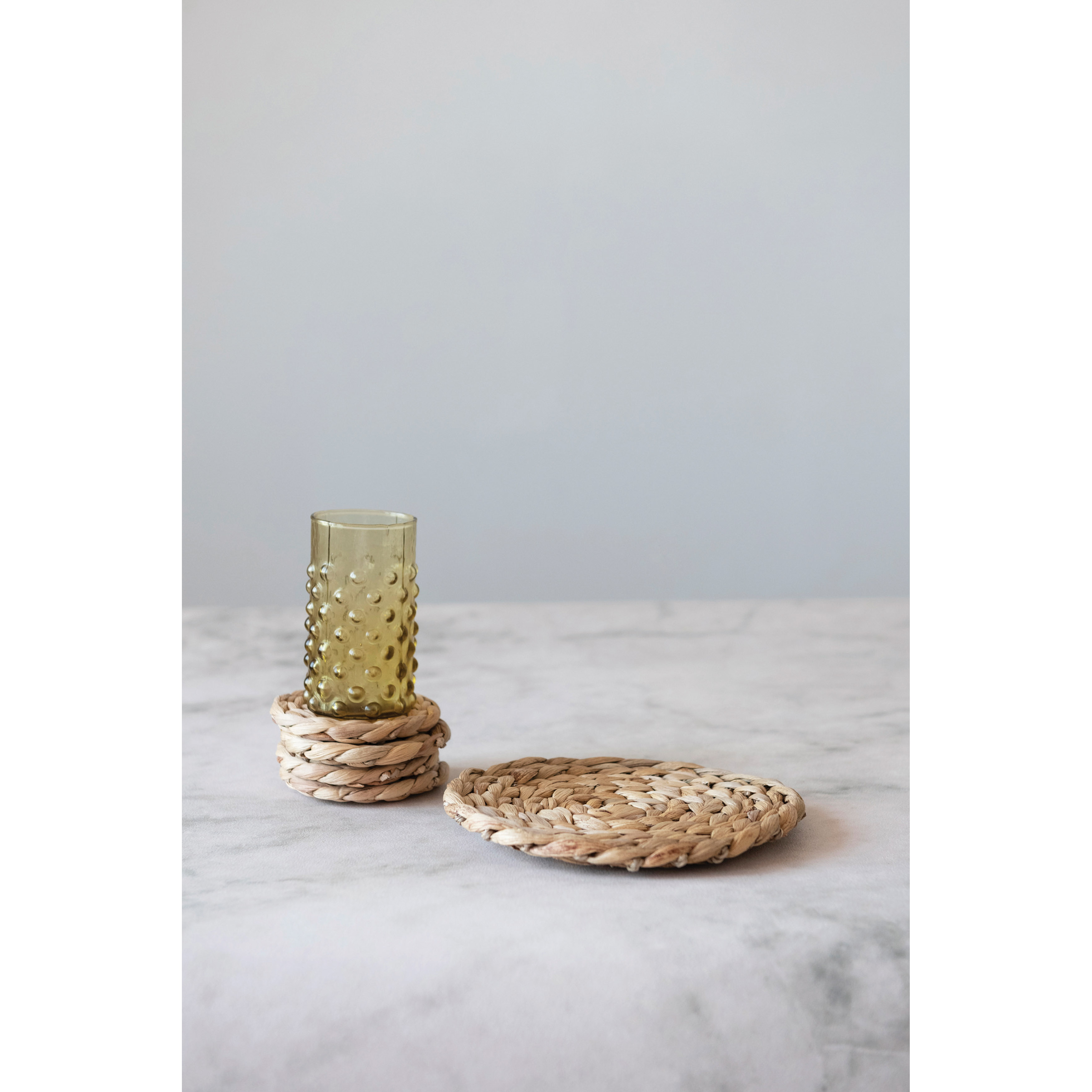 Hand-woven water hyacinth trivet and 4 coasters in a natural finish. Create a stunning tablescape with these artfully crafted coasters. Made from 100% water hyacinth. Curate a space that reflects your unique sense of style with intentionally designed home décor.