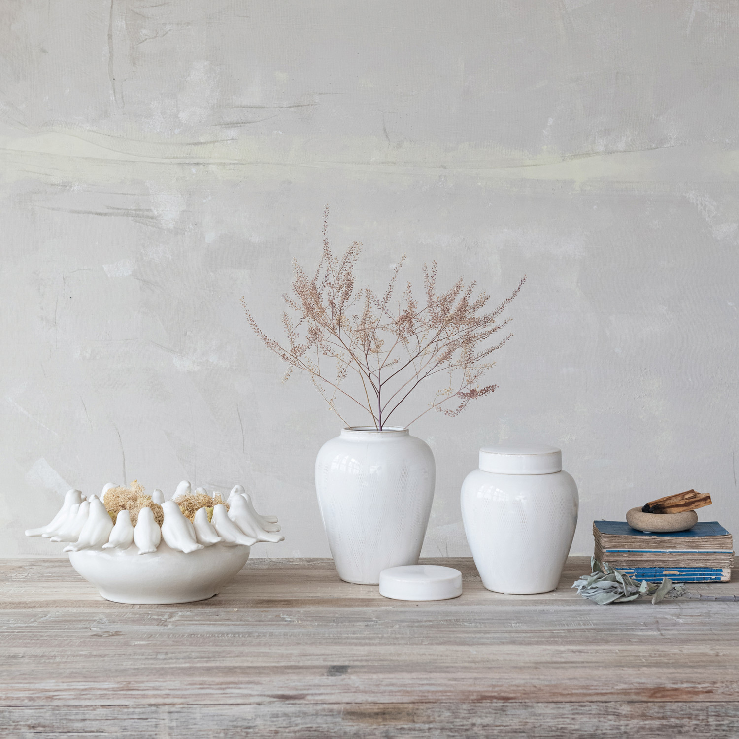 Catalog Name: 6-1/2" Round x 7-3/4"H Decorative Debossed Stoneware Ginger Jar w/ Linen Texture & Lid, Reactive Glaze, White (Each One Will Vary)