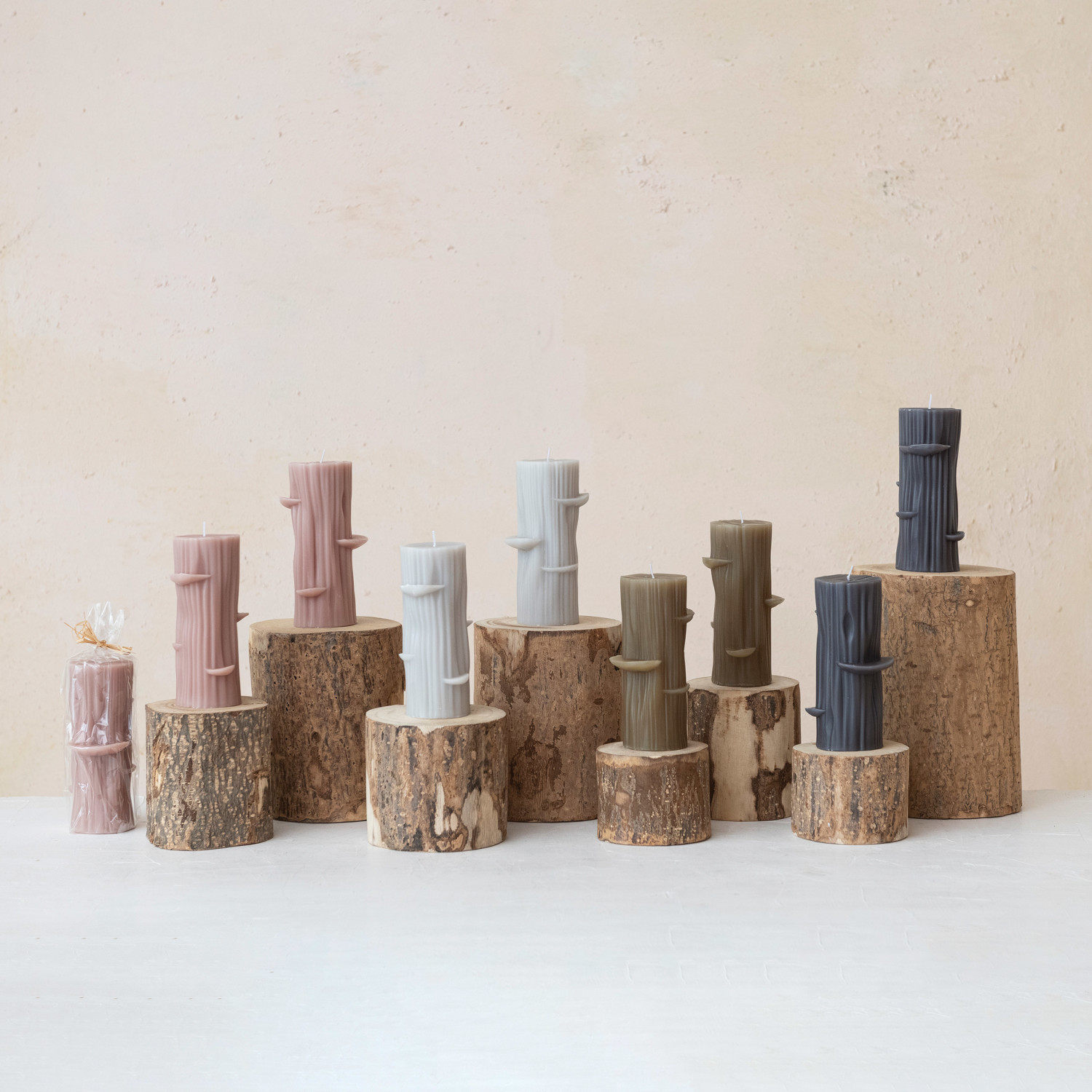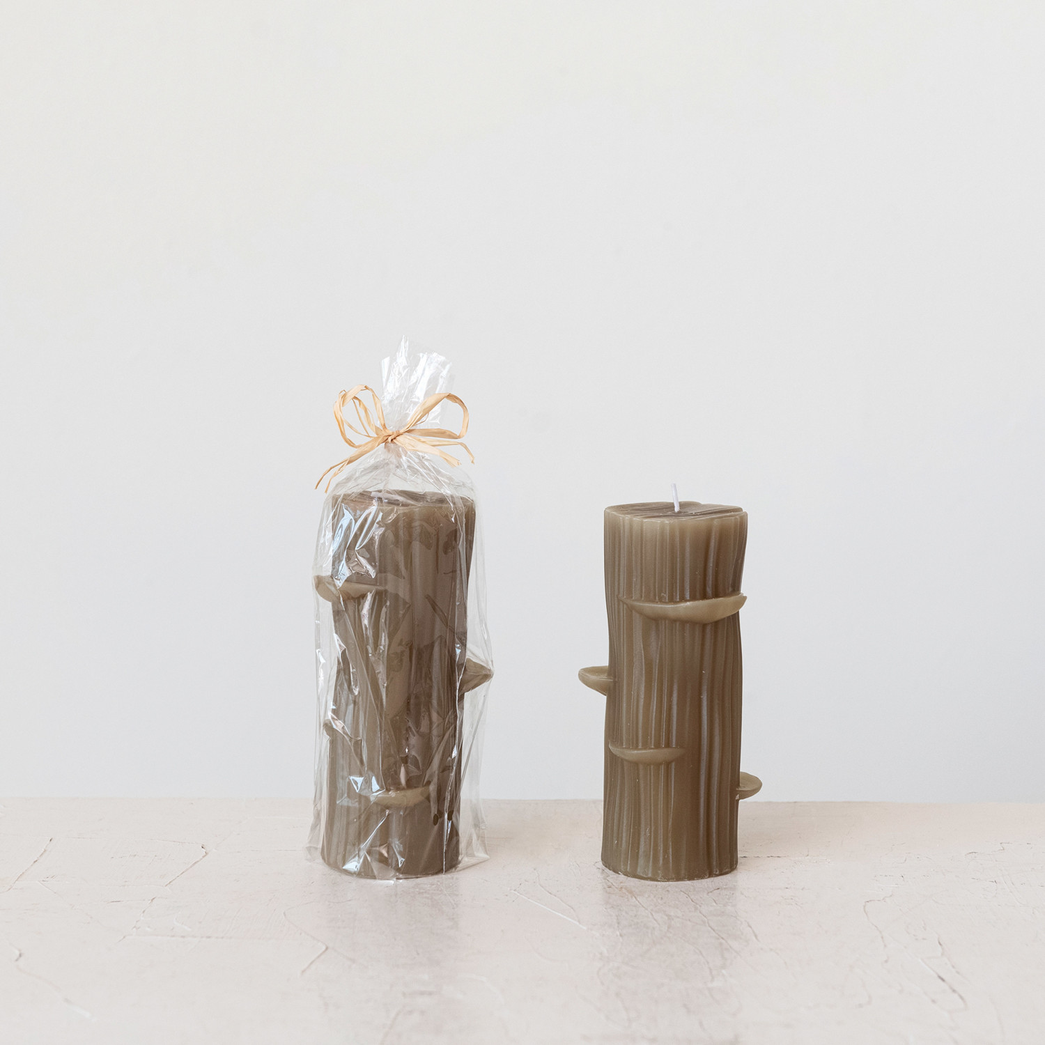 Unscented Log Shaped Candle w/ Mushrooms, Olive Color