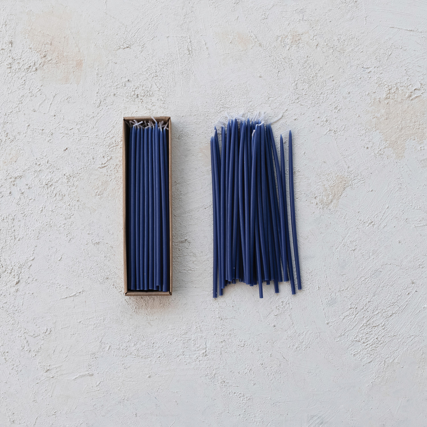 Catalog Name: Approx. 1/4" Round x 10"H Unscented Thin Taper Candles in Box, Navy Color, Set of 36 (Est. Burn Time 1-1/2 Hours)