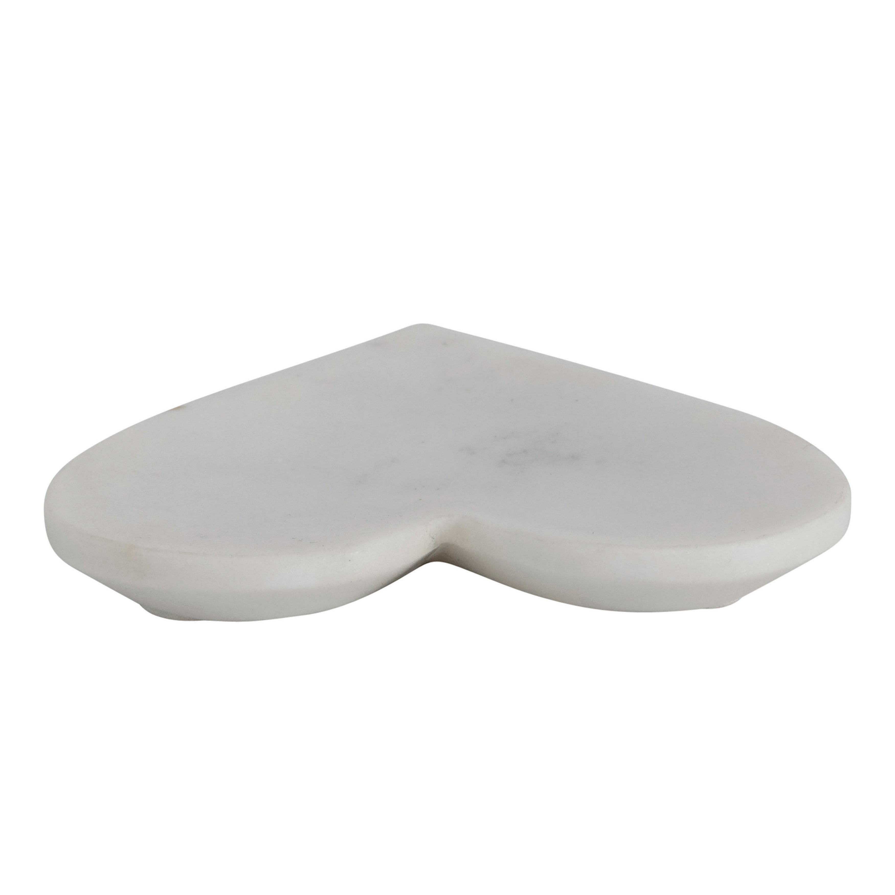 This charming decorative dish features genuine marble construction carved into a romantic heart shape. Decorative heart shaped marble dish in white naturally variating finish. Arrange rings and small jewelry inside and place on a vanity, or beautifully blend into a whimsical tablescape. Made from 100% marble.