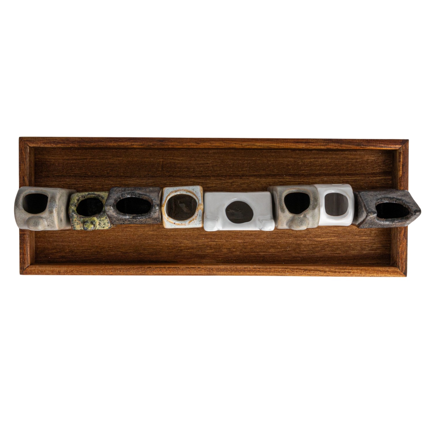 Catalog Name: 11-1/2"L x 4"W Wood Tray w/ (8) 2"H - 3-3/4"H House Shaped Vases, Reactive Glaze, Multi Color, Set of 9 (Each One Will Vary)