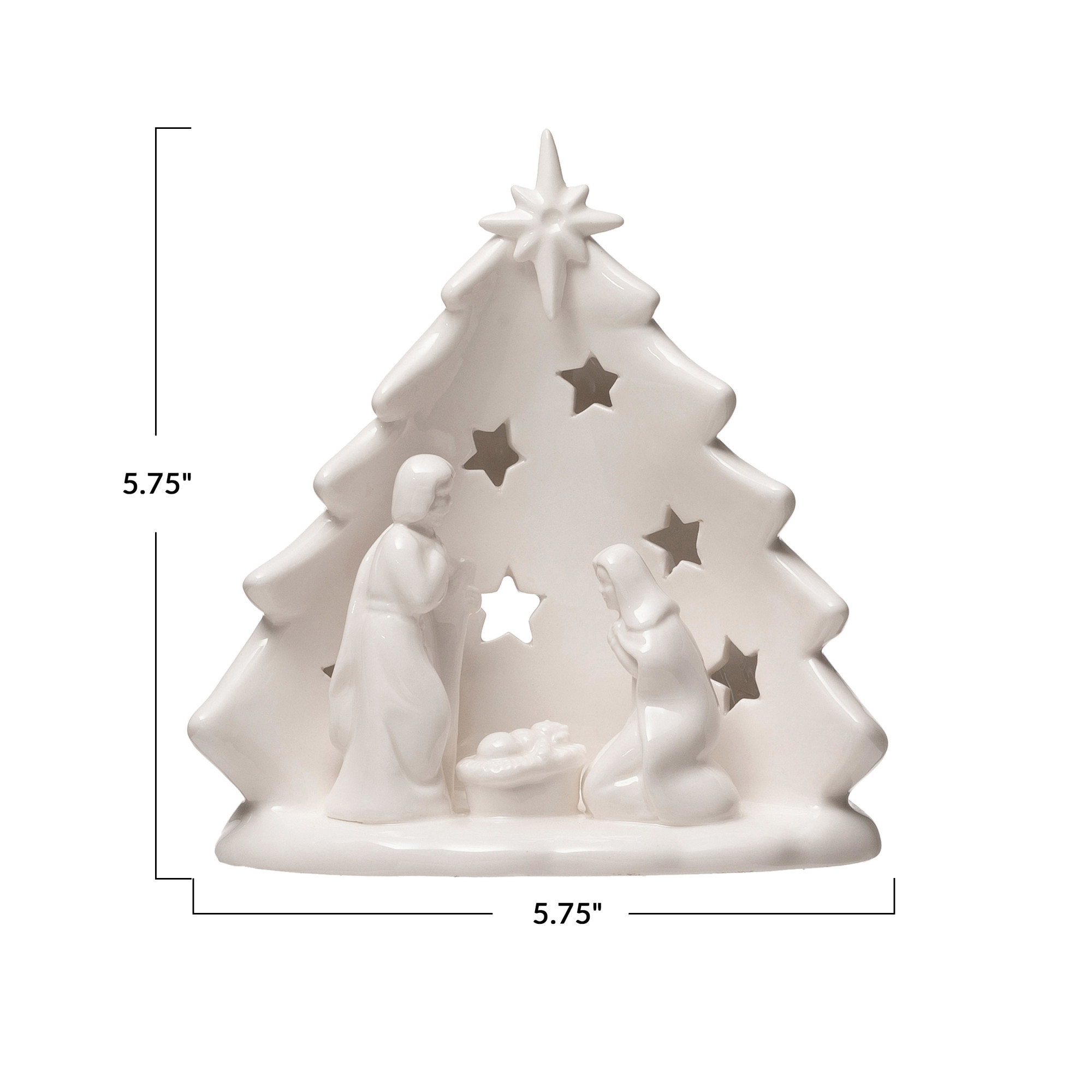 This candle holder is perfect for any festive home. Made out of stoneware, this piece is made out of stoneware in the shape of a tree, and features the holy family. With a neutral white color, this piece both blends in with any other decor styles, and stands out with its unique shape