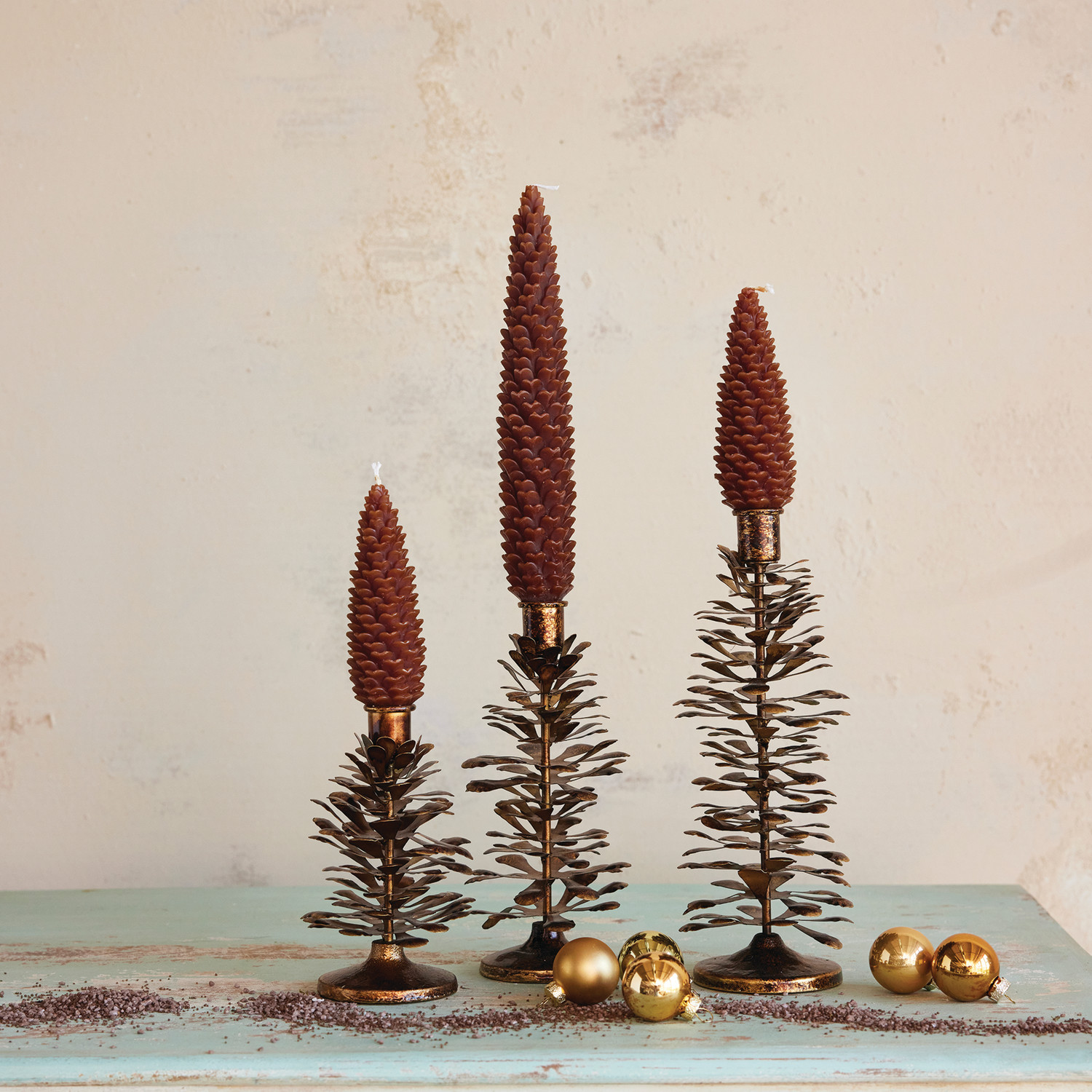 Metal Pinecone Shaped Taper Holder, Antique Gold Finish