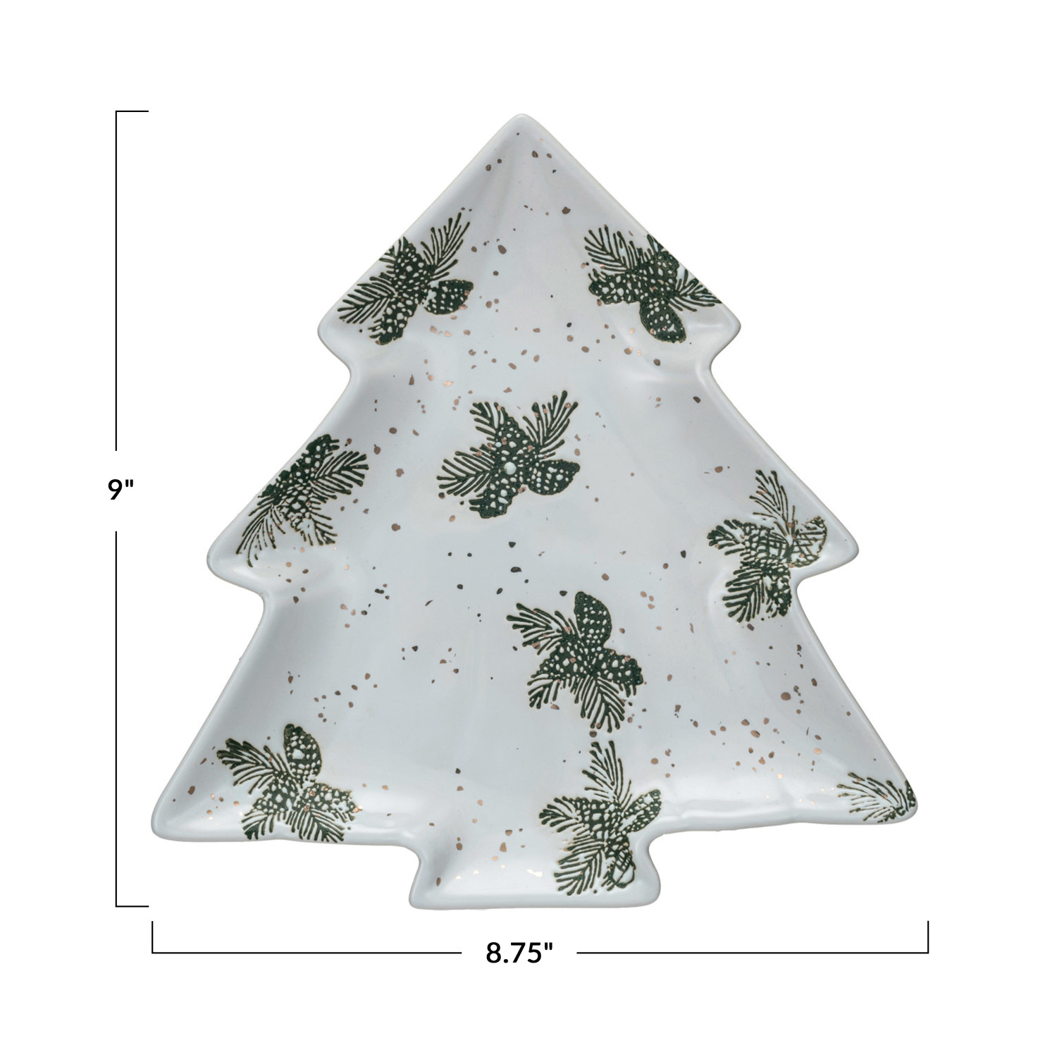 Catalog Name: 9"L x 8-3/4"W Stoneware Tree Shaped Plate w/ Wax Relief Pinecones, Pine Boughs & Gold Electroplating, White