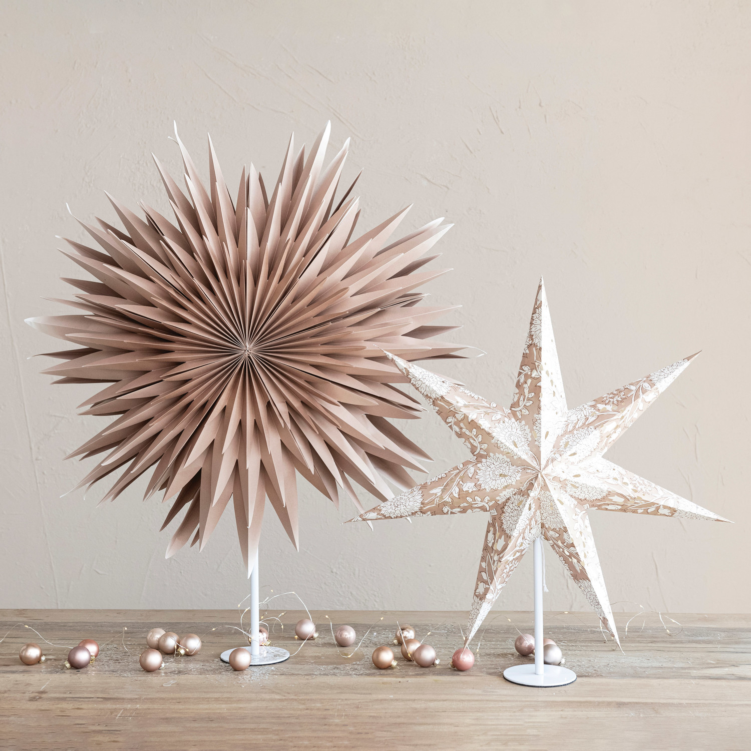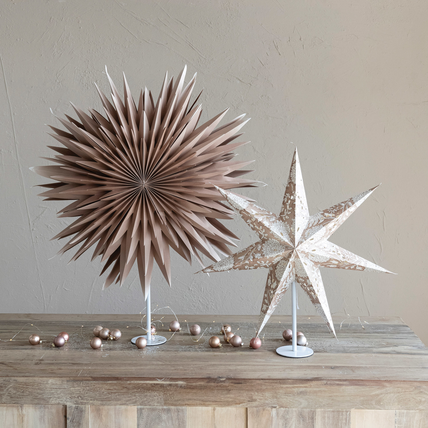 This brown and cream-printed paper folding star with LED light string and metal stand is a festive and fun piece that will enhance any space. The star's brown and cream color palette is warm and inviting. A printed pattern gives the star a distinctive, textured look, giving it contrast and balance. A LED light string adds charm and shine to the star, making it stunning. The star's modest, sleek metal stand creates a striking and unique piece. The star is made of paper, metal, and LED light, with a lightweight and durable quality. It requires 3 AA batteries. The star measures 24 inches in length, 7.5 inches in width, and 22 inches in height. This is a versatile and stylish piece that can be displayed on the floor or on a large surface. It is a perfect piece to add some sparkle and style to the holiday or winter decor. A festive and fun brown and cream printed paper folding star with LED light string and metal stand. A perfect piece to add some sparkle and style to the holiday or winter decor. Requires 3-pcs AA batteries.