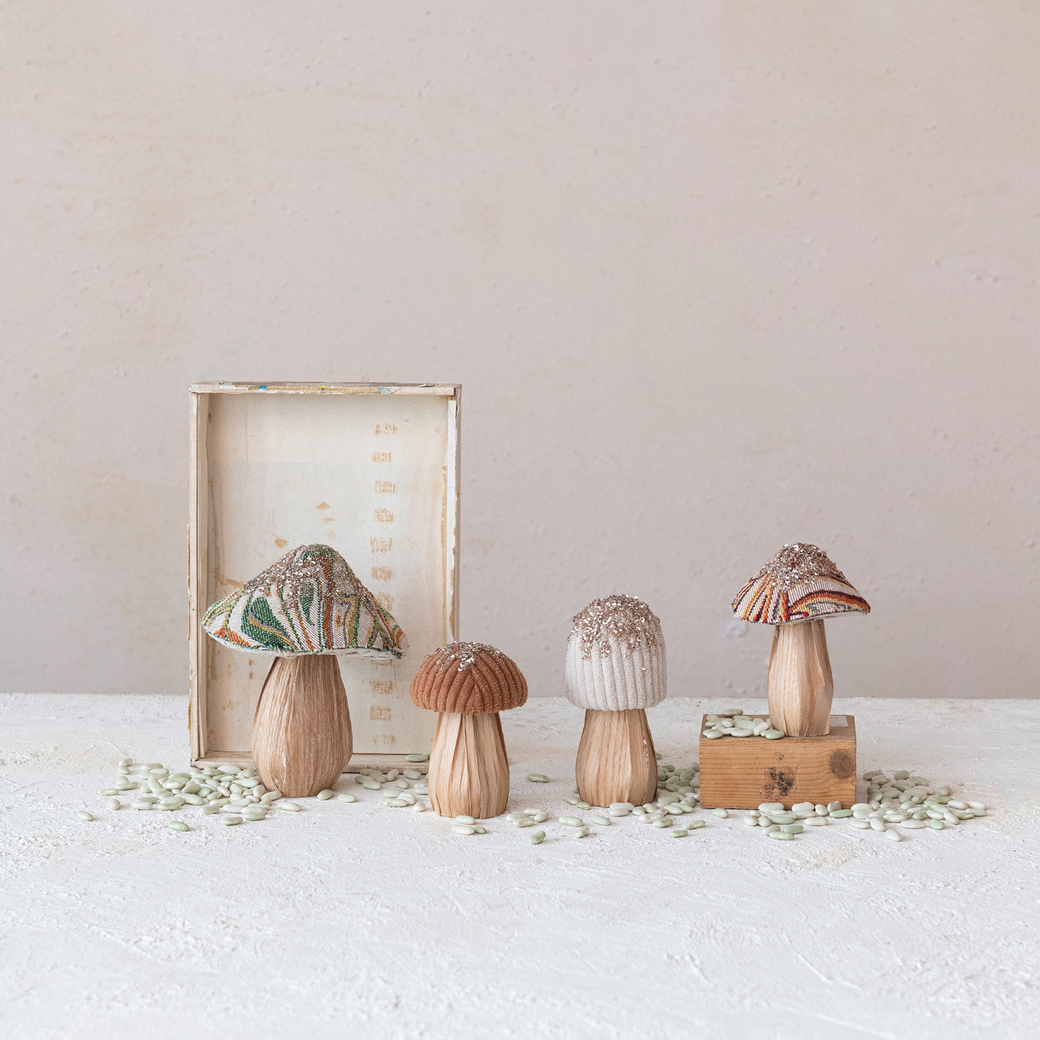 Fabric Topped Foam Mushrooms w/ Wood Base, Set of 4