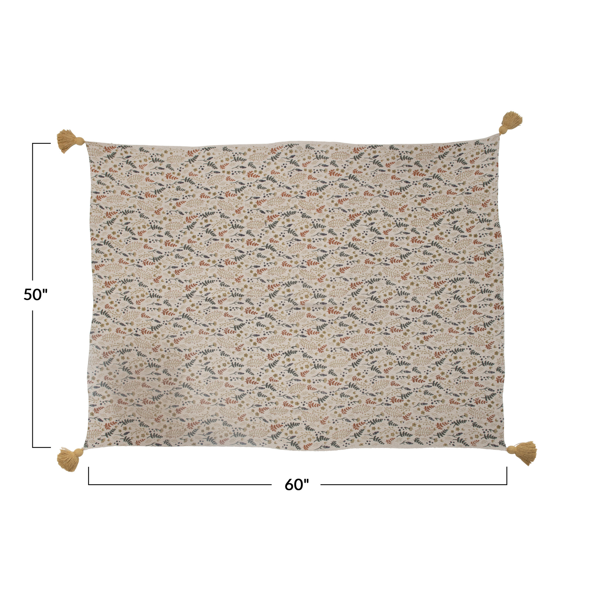 Add warmth and personality to your shopping nooks with this woven reclaimed cotton-blend printed throw with a soft and cozy design. This throw is made of reclaimed cotton blend, an eco-friendly fabric that provides comfort and durability. The throw features a neutral multi-color floral print that adds a touch of elegance and simplicity to the throw, while the yellow tassels on the corners add a touch of charm and personality to the throw. The throw is suitable for any space that needs texture and character, such as the living room, bedroom, office, or other area. It can also be an excellent gift for anyone who loves eclectic, bohemian, or global design. This throw measures 60 inches in length and 50 inches in width and is easy to care for. Simply machine wash cold with a mesh bag. Tumble dry low. Do not bleach, iron, or dry clean. Add this woven reclaimed cotton blend printed throw with floral pattern and tassels to the home and enjoy its beauty and functionality.