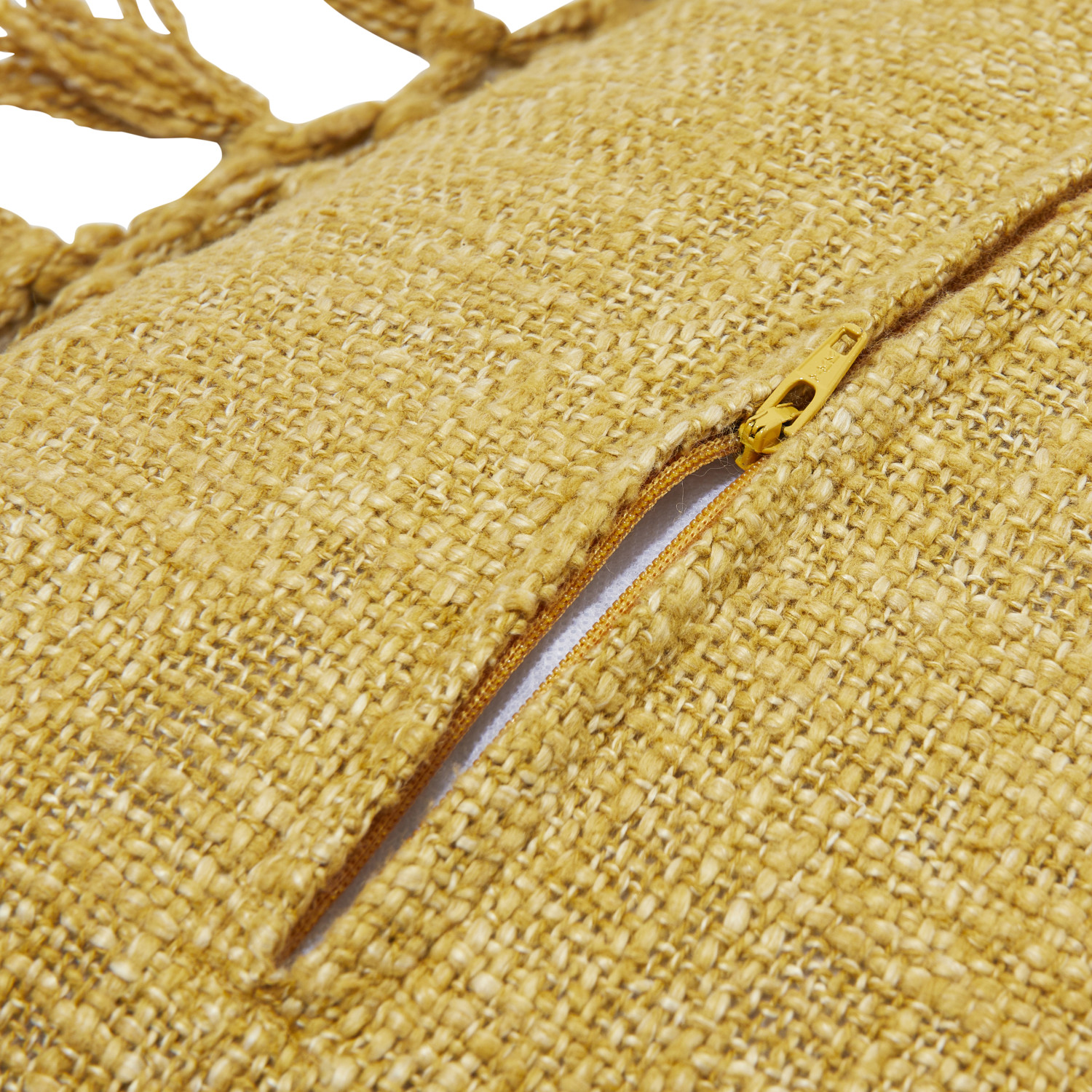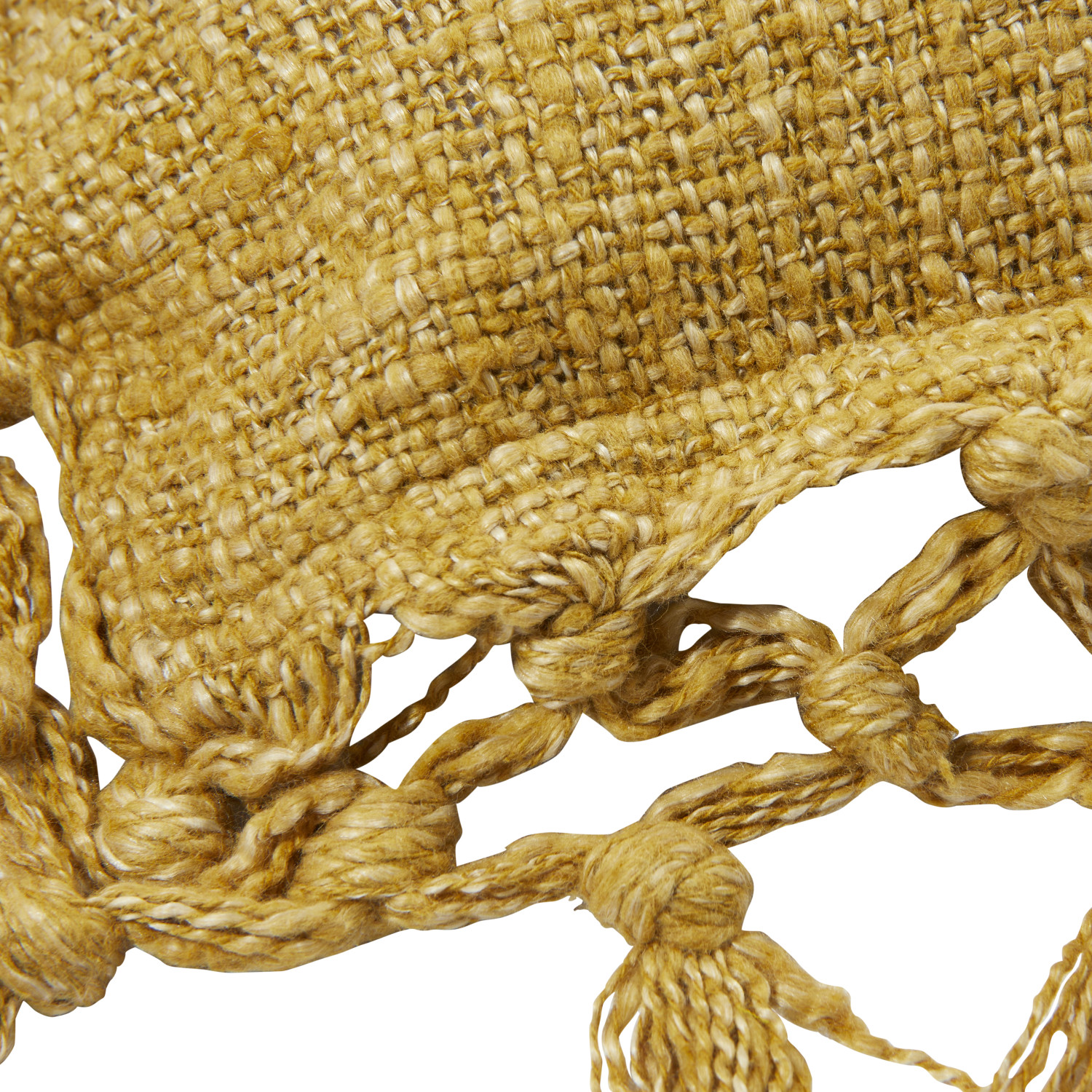 This boho-inspired throw pillow cover showcases soft cotton slub construction adorned with intricately crocheted fringe detail. Square mustard cotton slub throw pillow with crocheted fringe. Express your constantly evolving style with the simple addition of this eye-catching pillow. Removable cotton throw pillow cover with polyester insert; Hand wash, warm iron if needed.