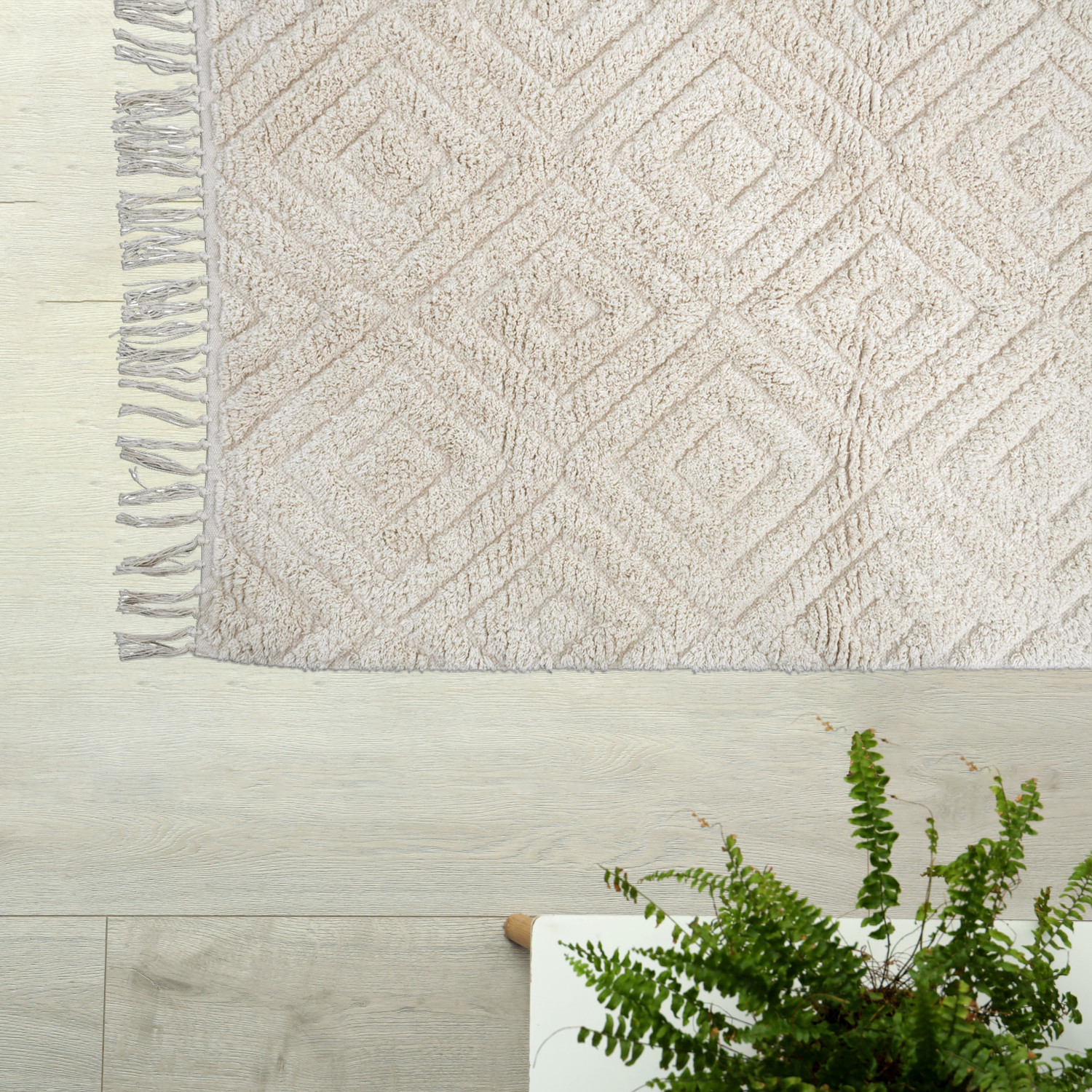 This cozy throw rug features a tufted diamond pattern on supple cotton with decorative fringe. Cream cotton tufted rug with diamond pattern and fringe. Spot Clean Only. 97% Cotton, 3% Other Fibers.