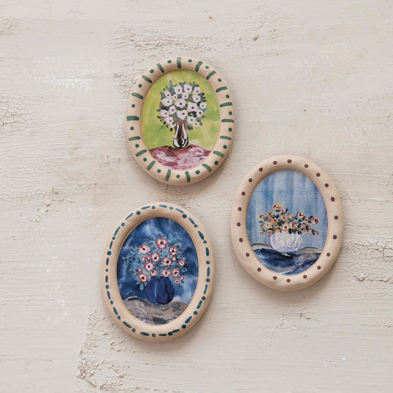 Catalog Name: 4-1/2"W x 5-3/4"H Oval Stoneware Plate Wall Décor w/ Flowers in Vase, Multi Color, 3 Styles (Hangs or Sits)